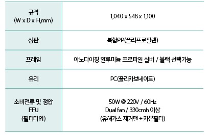 삼인싸이언스(주)에서 제공한 '폐액부스' 자료의 제품 특징, 제품 사양은 다음과 같다.