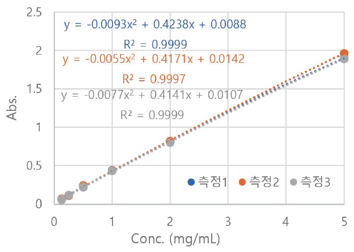 0.125-5.000 mg/mL 구간에서 측정된 데이터는 2차 다항식으로 피팅되었으며, 모든 반복 실험에서 결정계수(R2)가 0.999 이상으로 나타났다.