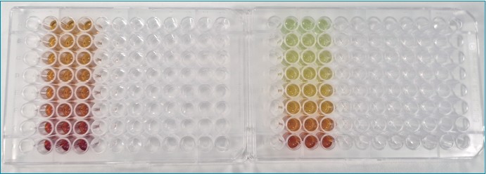 ② 각 well에 Working Reagent 200 ㎕를 멀티채널 파이펫으로 분주하였다. 시료 혼합 과정에서 발생할 수 있는 시간 차이를 줄이기 위해 빠른 연속 분주를 수행하였다.