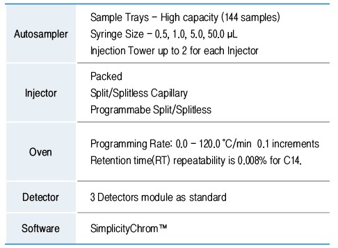 퍼킨엘머코리아(유)에서 제공한 PerkinElmer의 '기체 크로마토그래피(GC) 자료의 제품 특징, 규격은 다음과 같다.