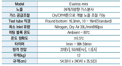 초소형 사이즈로 후드 내에 설치하여 사용할 수 있고, 최대 24개 시료 농축이 가능하며 각각의 노즐은 on/off 스위치를 통해 개별적으로 가스 공급이 가능하다. 또한 스피드 컨트롤러를 통하여 전체 가스 유량 조절을 할 수 있다.