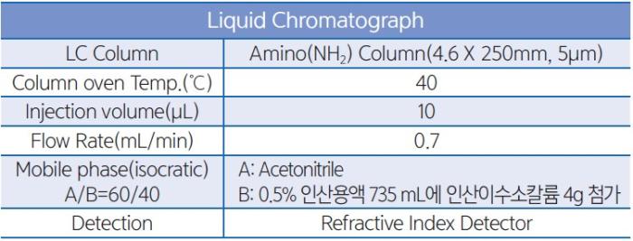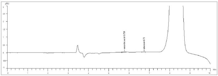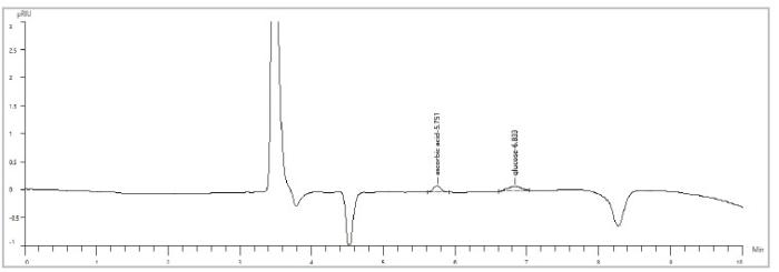 본 실험에서는 아미노(NH2) HPLC 컬럼을 이용하여 아스코르브산과 포도당의 피크를 확인하고 실제 시료에 대해서 위 두 물질의 함량이 0.1% 이내에 있는지를 분석하였다.