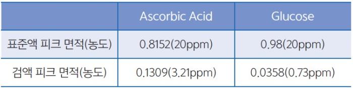 1. 기능성화장품 기준 및 시험방법에 따라 아스코르브산과 포도당을 RI 검출기를 사용하여 동시에 분석하였다.