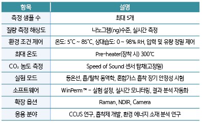 특히 CO₂와 수분(H₂O)의 농도를 각각 독립적으로 제어할 수 있는 가스 혼합 시스템이 내장되어 있어, 다양한 온도(5°C ~ 85°C)와 습도(최대 98% RH) 조건 하에서 직접공기포집(DAC), 연소 후 탄소포집(PCC) 등 탄소 포집 및 저장(CCUS) 연구에 최적화된 환경을 재현한다.