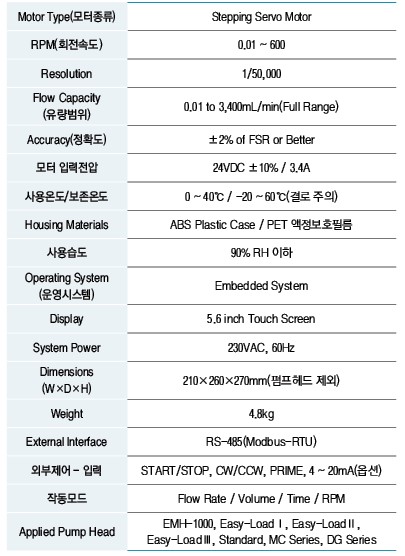 •넓은 Flow Range - 고성능 Stepping Motor.(0.01 ~ 3,400mL/min)
