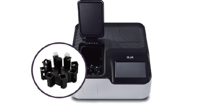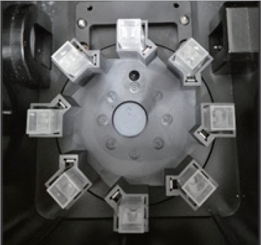 [그림 3]. Alpha UV-Vis Spectrophotometer의 8셀 멀티셀 홀더 – Reference Cell에는 증류수를 사용하여 Auto-zero를 수행하였다.
