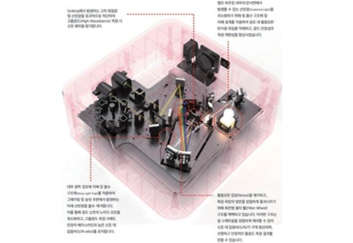 각 광학 블록의 경계면에는 광 누설 방지 차폐벽(Optical Shielding Wall)과 흡광 구조체(Stray Light Trap)를 다중으로 배치하였다. 이를 통해 미세 산란광을 흡수·제거하고, Baseline 안정성과 장기 측정 안정성을 동시에 확보하였다.