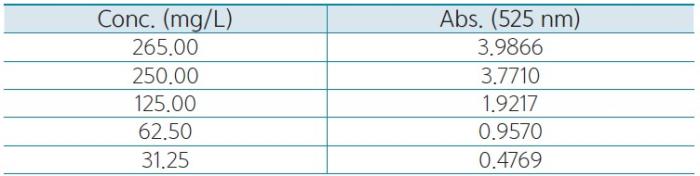 Alpha UV-Vis Spectrophotometer를 이용하여 0.03-265 mg/L 범위의 과망간산칼륨 용액을 측정한 결과는 [표 2]에 나타내었다. 525 nm에서 측정된 흡광도와 농도 간의 관계는 우수한 직선성을 보였으며, 회귀식은 A = 0.0151C + 0.0027, 결정계수(R²)은 0.9999로 계산되었다.