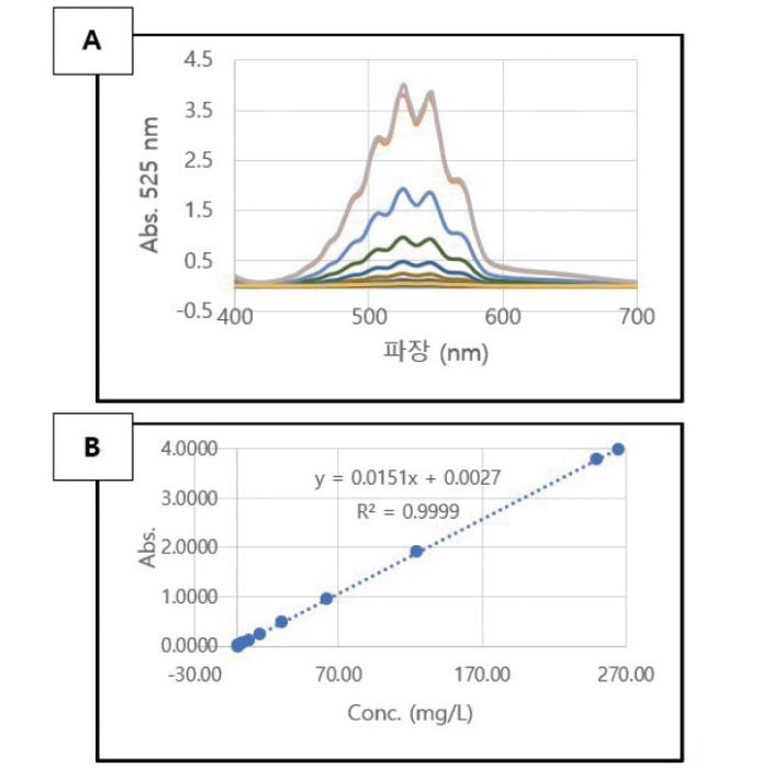 측정에는 케이랩(주)(K LAB)의 Alpha UV-Vis Spectrophotometer를 사용하였다. 본 장비는 8셀 멀티셀 홀더를 기본 장착하고 있어 여러 시료를 연속적으로 측정할 수 있다. 10 mm 일회용 큐벳(Ratiolab, Cat.No. 2811110)을 사용하였으며, Reference Cell에는 증류수를 채워 Auto-zero를 수행한 후 분석을 진행하였다. 모든 시료는 Photometric Mode에서 525 nm 파장에서 측정되었다.