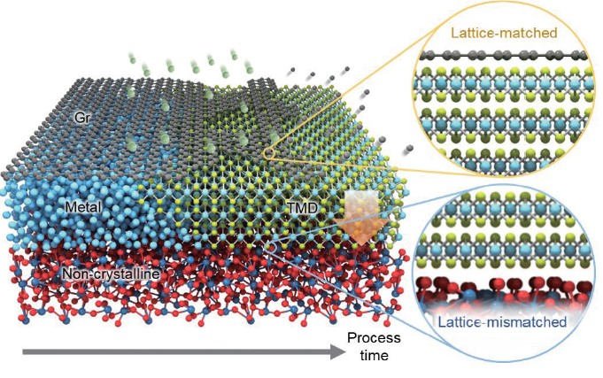 최근에는 우리 연구실은 그래핀의 나노포어를 매개로 한 이차원 반도체 물질의 단결정 성장 기술인 하이포택시(Hypotaxy)가 개발하여 Nature지에 보고하였다. 핵심은 그래핀과 같은 2D 템플릿의 나노포어를 통해 아래 방향으로 단결정 이차원 반도체 층이 자라면서도 템플릿과 반데르발스 결정 정합을 유지하는 성장 메커니즘이다. 나노포어 크기가 5 nm보다 작을 때는 핵 생성이 나노포어 당 한 개로 제한되어 결정 정합이 유지되고, 그보다 크면 여러 방향으로 정렬된 다수의 핵이 생긴다. 따라서 그래핀의 나노포어를 정밀하게 제어하면 단결정으로 정렬된 이차원 반도체 물질의 두께 제어가 가능한 형태로 합성이 가능하고, 공정 중 그래핀이 자연스럽게 제거되어 매우 깨끗한 표면의 단결정 이차원 반도체를 얻을 수 있다.