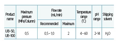 한국쇼코츠쇼(주)에서 제공한 Resonac Corporation의 'Shodex UB Series (UB-50, UB-100)'의 제품 특징, 제품 사양 그리고 제품 구성은 다음과 같다.