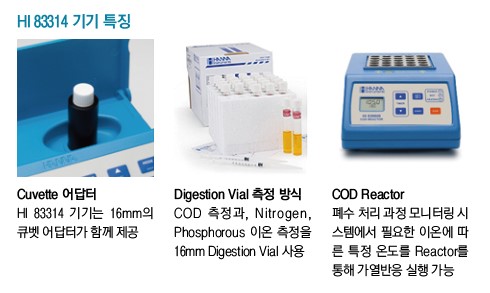 COD, Total Nitrogen, Total Phosphorous와 같은 폐수처리에서 중요하게 측정되는 이온 분석이 가능함으로써, 생물학적 화학적 반응에 대한 통제 및 관리가 가능하다. HI 83314 기기의 흡광도 측정 모드(Absorbance Measurement Mode)를 통해, 측정 과정의 확인이 가능하며, 사용자는 이를 통해, 정확한 이온 농도를 확인할 수 있다.