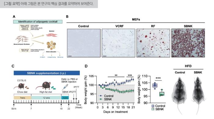 [그림 1]. A. In vitro에서 섬유아세포를 갈색지방세포로 유도하는 스킴, B. Oil Red O 염색 결과, C. 동물실험 투여 실험 디자인, D. 고지방식이 쥐에서 체중 및 지방 감소 효과(뚱뚱한 쥐와 마른 쥐 비교) (성균관대학교 의학과 정밀의학교실 김경규 교수 제공).