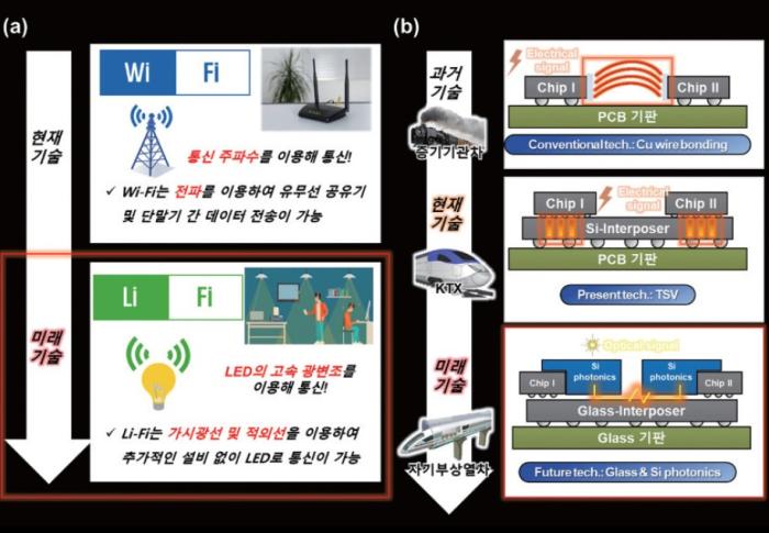 [그림 1]. 빛을 활용한 데이터 전송 기술의 발전 흐름: (a) 통신 기술, (b) 칩간 데이터 전송 기술