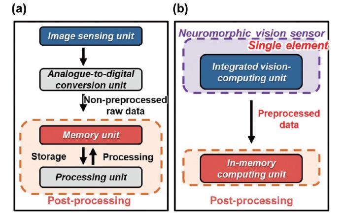 [그림 2]. (a) 폰 노이만 비전 컴퓨팅 구조와 (b) 뉴로모픽 비전 컴퓨팅 구조 비교