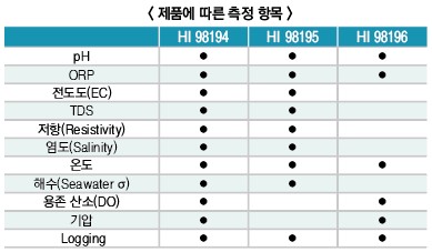 기술 집약형 휴대용 다항목 측정기로써 많은 산업 및 과학 분야에서 이상적 으로 사용할 수 있는 수질 측정기이다. 각 측정 항목의 센서를 프로브에 연결하여 측정하는 방식으로 여러 가지 항목을 한 번에 측정하며, PC 연결 기능을 통해 측정 데이터를 관리하기에도 편리하다.