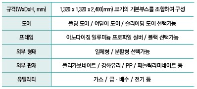 •외부패널 / 중간재 / 내부패널은 PC, 강화유리, 페놀릭 라미네이트, PP, 아스텔, 복합패널 등 사용자가 원하는 공간 구성에 따라 다양한 선택이 가능하며 중간재에 특수 방음소재나 내열재 등을 삽입하여 소음감소와 냉·난방 효율을 증가시킬 수 있다.