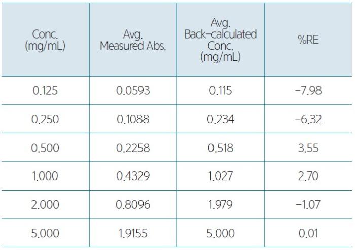 측정된 흡광도 값으로부터 Back-calculated 농도를 산출하고, 기준 농도와 비교하여 %RE(Relative Error)를 계산하였다.