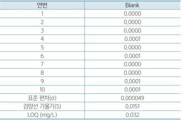 본 실험에서 σ = 0.000049, S = 0.0151의 값을 적용하였으며, 이를 통해 LOQ는 0.032 mg/L로 산출되었다. 이 결과는 Alpha UV-Vis Spectrophotometer가 0.032 mg/L 이상의 저농도 영역에서도 정량이 가능한 수준의 감도와 신호 안정성을 보유함을 나타낸다.